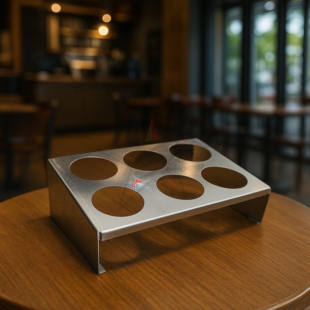 Ανθεκτική σχάρα αλουμινίου για τη μεταφορά 6 ποτηριών καφέ. Ιδανική για επαγγελματίες και καταστήματα εστίασης που θέλουν σταθερότητα, ταχύτητα και στυλ στις παραδόσεις τους. Κατασκευασμένη από ελαφρύ αλλά στιβαρό αλουμίνιο, με μοντέρνο και εργονομικό σχεδιασμό.